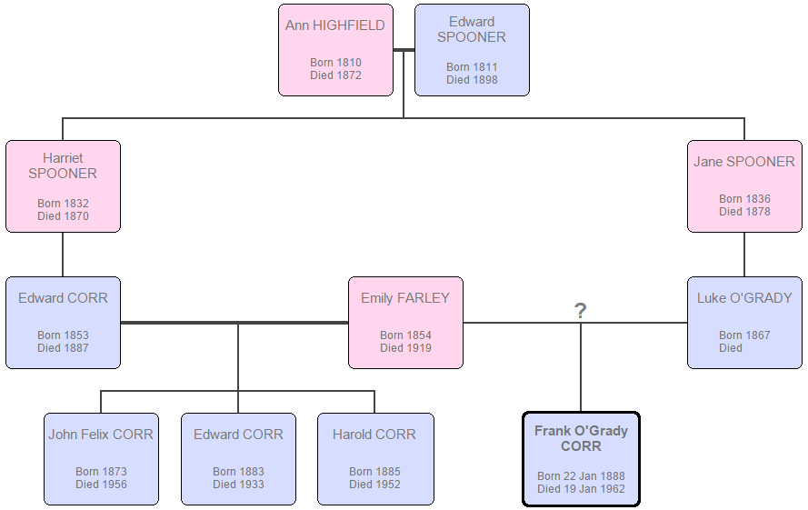 Edward was born in Wolverhampton in 1853 and worked as a machinist/turner and fitter in Birmingham before his early death.3,4,5,14 He married (Frank O’Grady/Corr’s mother) Emily Farley on 14 July 1872.21 Edward’s parents were Felix Corr (1834-1874) and Harriet Spooner.22